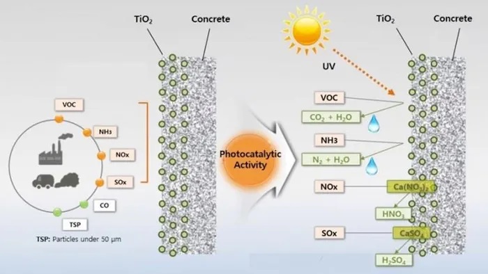 Nhóm nghiên cứu KICT thiết kế bê tông, phủ một lớp titan dioxit tạo ra các phân tử, được gọi là các loại oxy phản ứng (ROS) khi có tác động của ánh sáng mặt trời và các loại ánh sáng khác.