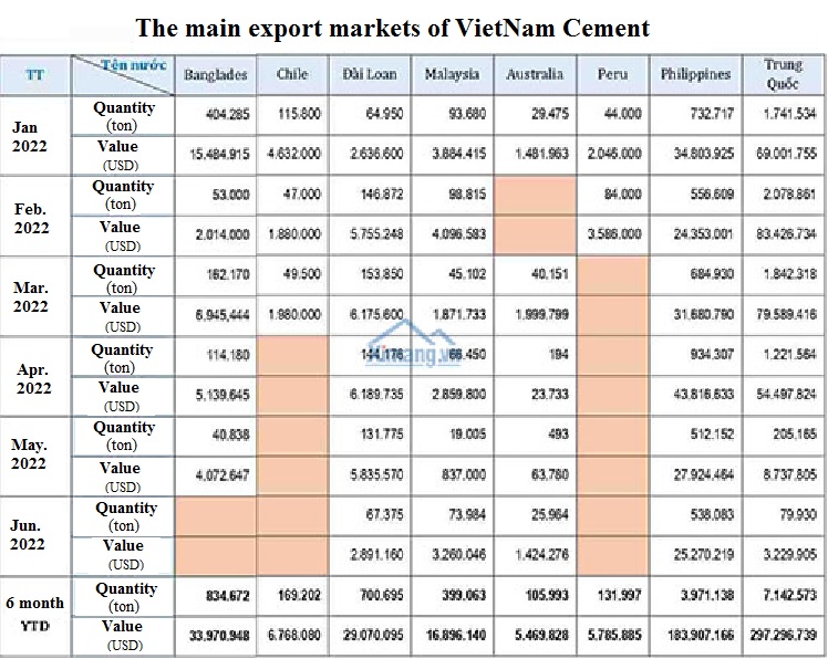 The largest export market of Vietnam's cement industry is China, which has faced difficulties in the first 6 months of 2022. China is gradually tightening the real estate market with a policy of "three red lines" that limits its ability to get loans or loans' renewal of real estate developers. Therefore, the demand for cement imports from the Chinese market has been decreasing.