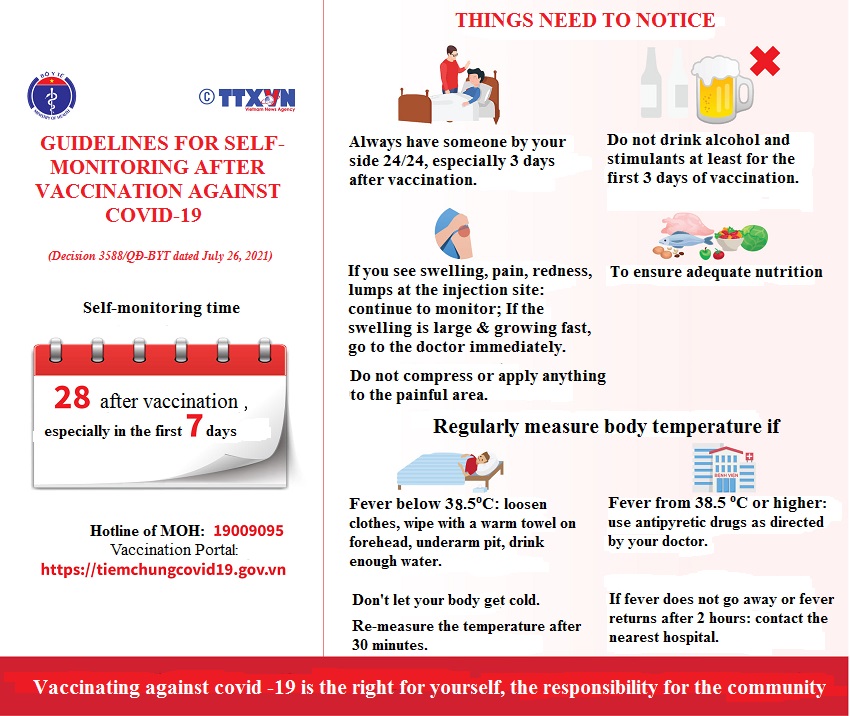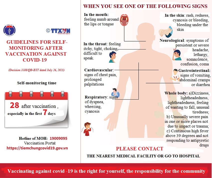 For people vaccinated with COVID-19 vaccine, the Ministry of Health guides the self-monitoring period of 28 days after vaccination, especially within the first 7 days: