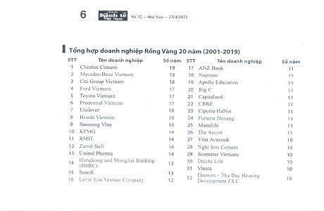 Danh sách Top các doanh nghiệp FDI nhận giải Rồng vàng trong 20 năm qua (Nguồn:Thời báo kinh tế Việt Nam)