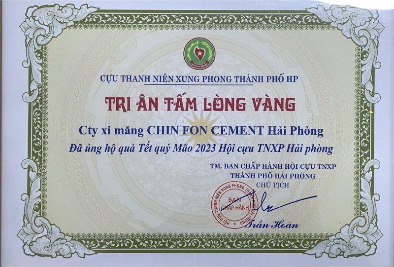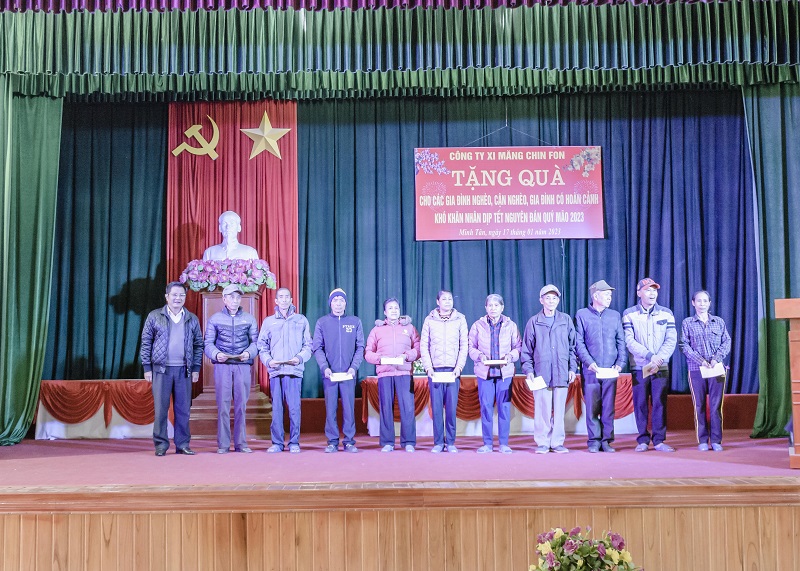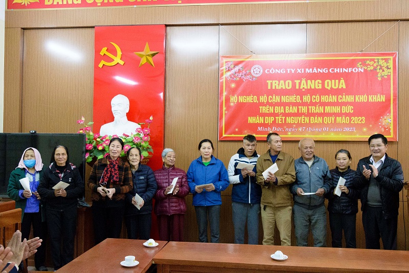 Trong các ngày 17&18/01/2023, nhân dịp chào xuân Quý Mão 2023, Công ty xi măng Chinfon đã phối hợp với Đảng bộ, UBND, HĐND thị trấn Minh Đức, xã Minh Tân và Gia Đức, huyện Thủy Nguyên, thành phố Hải Phòng để trao tặng gần 500 trăm suất quà Tết cho các hộ gia đình nghèo, cận nghèo, các gia đình chính sách, các gia đình có hoàn cảnh đặc biệt khó khăn trên địa bàn. Công ty cũng đã phối hợp với Hội cựu thanh niên xung phong thành phố Hải Phòng trao tặng 50 suất quà, mỗi suất 500.000 đồng cho các cựu thanh niên xung phong có hoàn cảnh khó khăn tại địa bàn thành phố Hải Phòng.