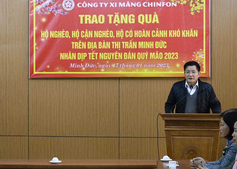 Ông Lê Minh Hiếu, Phó Tổng giám đốc đại diện Công ty xi măng Chinfon trao tặng quà Tết tại thị trấn Minh Đức