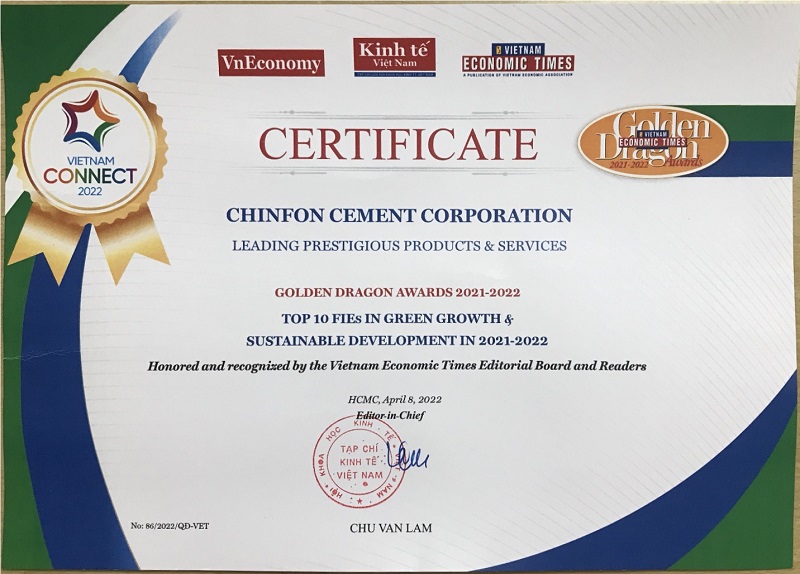 Tại Lễ trao giải Rồng vàng 2022, CÔNG TY XI MĂNG CHINFON vinh dự được bình chọn Top 10 doanh nghiệp FDI tiêu biểu. Các doanh nghiệp trong Top 10 năm nay là các doanh nghiệp FDI xuất sắc, tiêu biểu tại 6 ngành nghề, gồm Samsung, Intel Products Vietnam, Qualcomm Vietnam, VSIP, Gamuda Land Việt Nam, DHL-VNPT, Best Express, Honda Việt Nam, Chinfon Cement, La Vie.