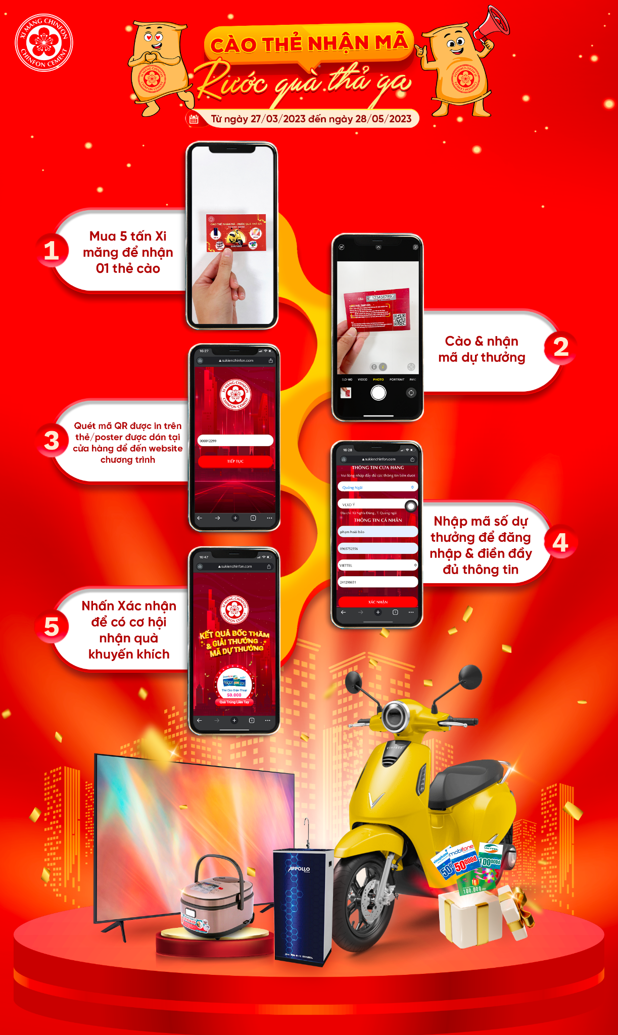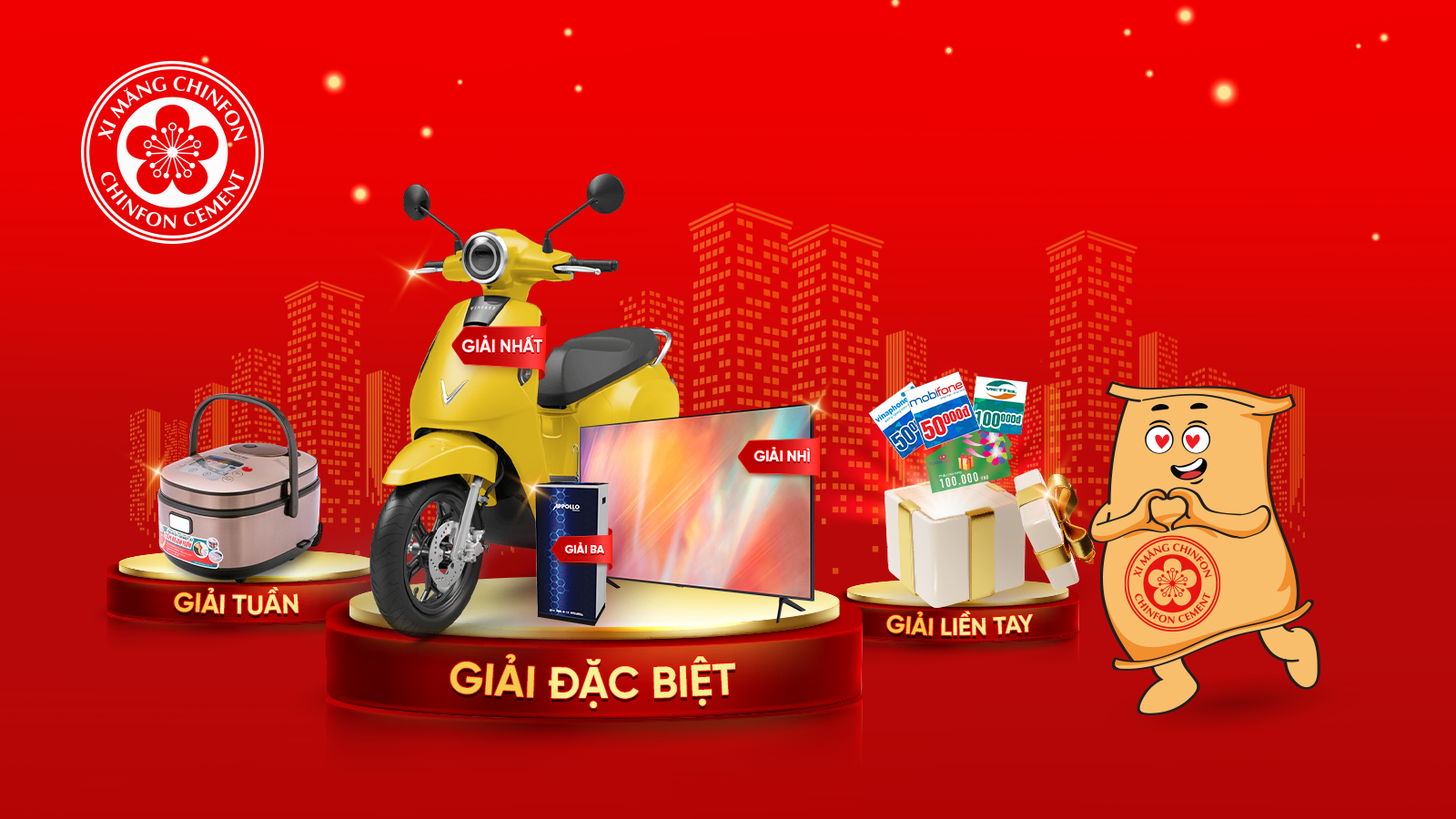 Từ ngày 27/3/2023 – 28/5/2023, Xi măng CHINFON mang chương trình khuyến mãi cào thẻ siêu hot quay trở lại 8 tỉnh/thành miền Trung và Nam Bộ bao gồm Đà Nẵng, Quảng Nam, Quảng Ngãi, Phú Yên, Lâm Đồng, Đồng Nai, Hồ Chí Minh và Vũng Tàu với những phần thưởng vô cùng giá trị như xe máy điện Vinfast, tivi Samsung, máy lọc nước Appollo,... cùng rất nhiều quà tặng hấp dẫn khác