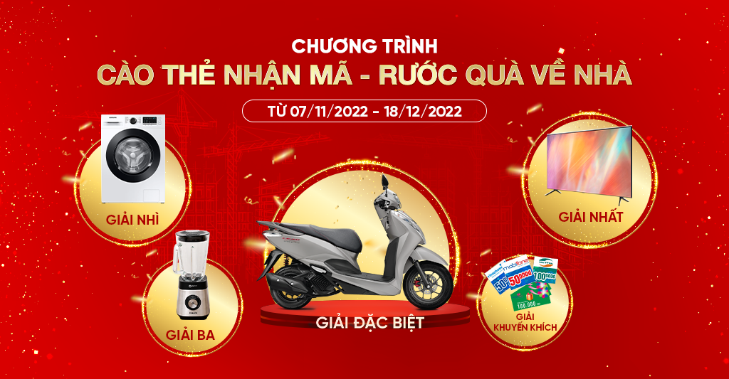 Ngoài những phần quà giá trị từ vòng quay đặc biệt, khách hàng còn có cơ hội nhận những phần quà khuyến khích là thẻ cào điện thoại trị giá 50.000đ hoặc 100.000đ hoặc phiếu mua hàng Coopmart 100.000đ khi tham gia cào thẻ quét mã trực tiếp tại các cửa hàng vật liệu xây dựng.