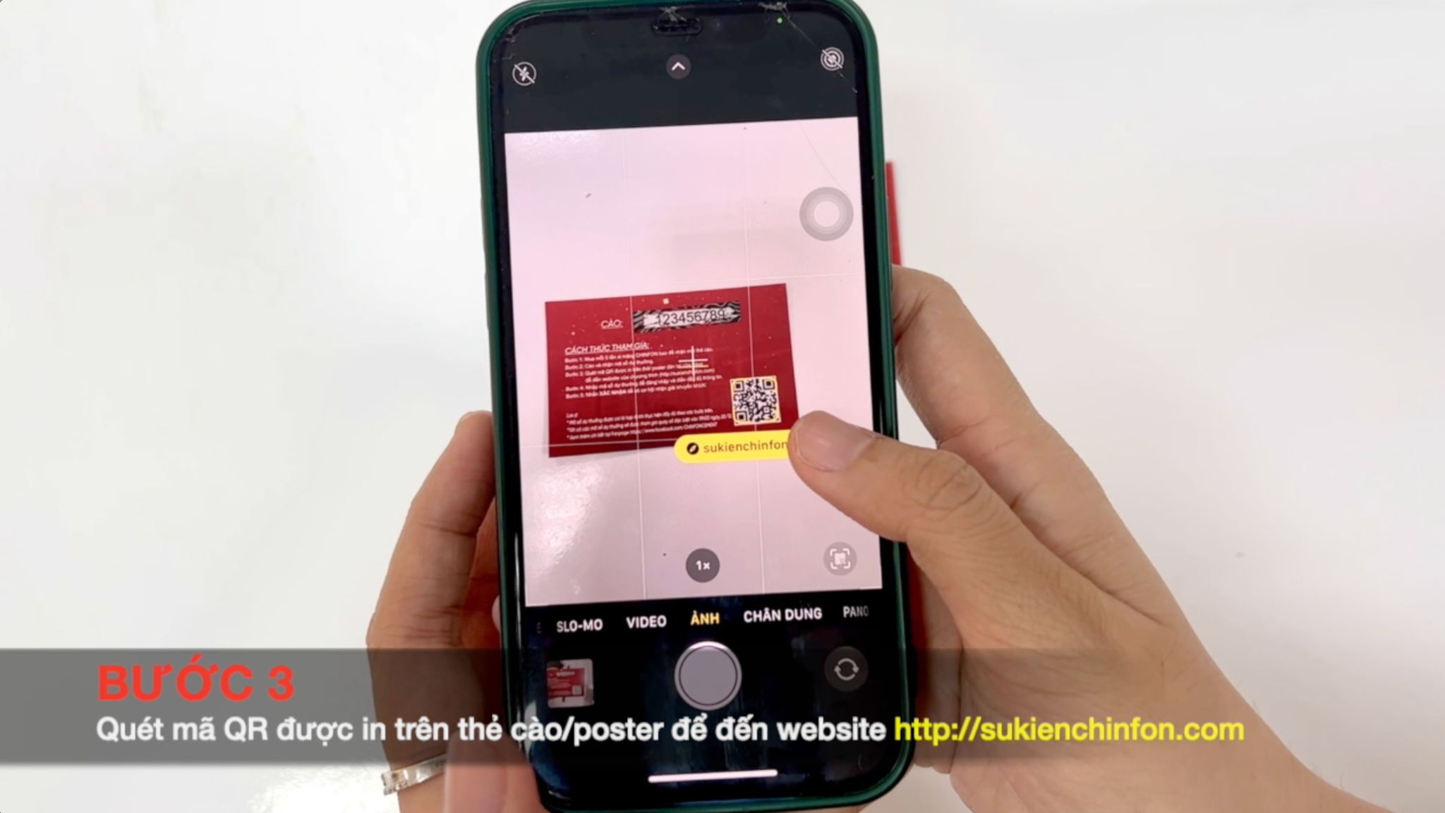 Bước 3: Mở camera và quét mã QR trên thẻ cào/poster được dán tại cửa hàng để đến website của chương trình https://eventcfc.com/