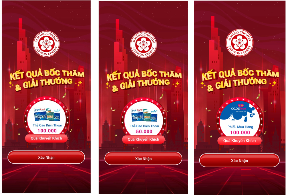 Danh sách trúng thưởng sẽ được công bố trực tiếp sóng livestream tại fanpage của Xi măng Chinfon (https://www.facebook.com/CHINFONCEMENT/). Sau khi công bố kết quả, Xi măng Chinfon sẽ gọi điện qua số điện thoại để thông báo trúng thưởng cho khách hàng trong vòng 7 ngày kể từ khi có kết quả trúng thưởng (không tính lễ tết, Thứ 7 & CN).