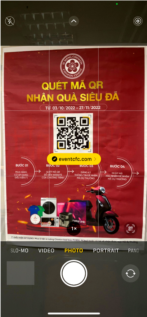 Bước 1: Mở camera và quét mã QR trên poster được dán tại cửa hàng để đăng nhập vào website của chương trình https://eventcfc.com/.