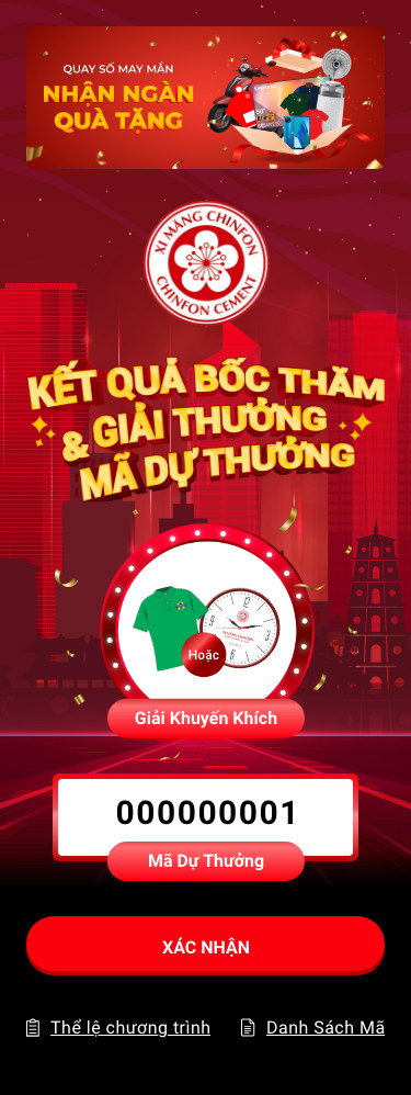 Những phần quà siêu khuyến mãi mùa hai đang chờ đợi bạn. Còn chần chừ gì nữa mà không nhanh tay Quét mã - Quay số để nhận ngay những phần quà siêu chất đến từ Xi măng Chinfon nào!