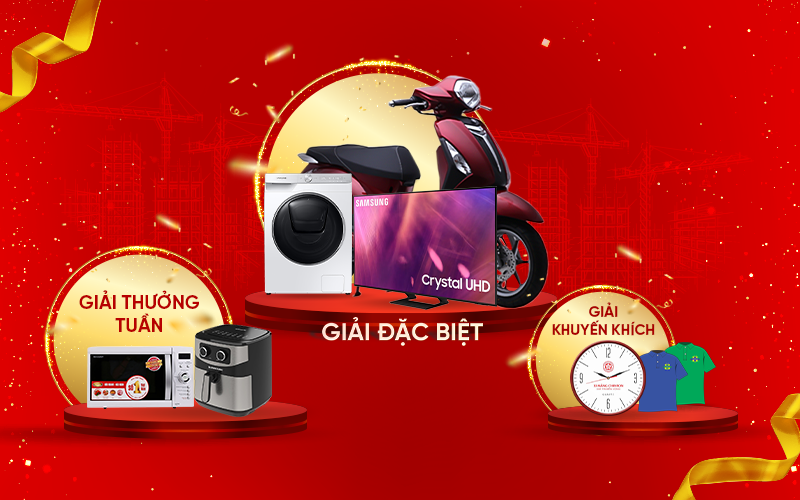 Lưu ý: Cứ 5 tấn xi măng khách hàng sẽ được quy đổi thành một mã dự thưởng. Ví dụ khách hàng mua 5-9 tấn sẽ được 1 mã, mua 10-14 tấn sẽ nhận được 2 mã, mua 15-19 tấn sẽ nhận được 3 mã,.. Càng nhiều mã dự thưởng, cơ hội trúng các giải thưởng siêu giá trị sẽ càng cao.