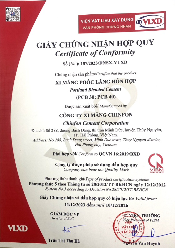 Portland blended cement PCB30; PCB40 manufactured by Chinfon Cement Corporation at Trang Kenh Plant conform to QCVN 16:2019/BXD