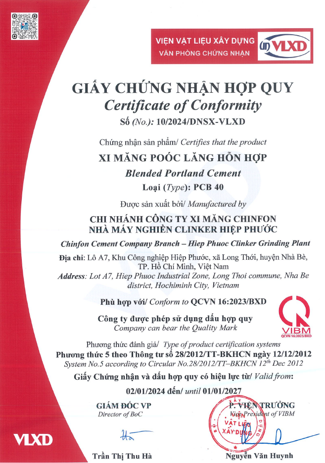 Xi măng poóc lăng hỗn hợp PCB40 được sản xuất bởi công ty xi măng Chinfon tại nhà máy nghiền clinker Hiệp Phước phù hợp với QCVN 16:2023/BXD