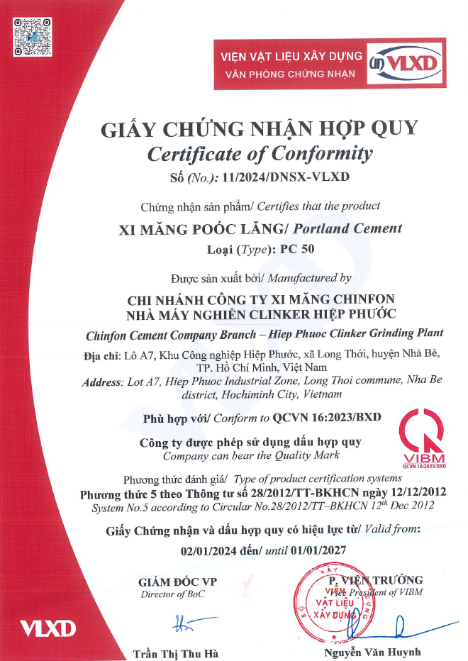 Xi măng poóc lăng PC50 được sản xuất bởi công ty xi măng Chinfon tại nhà máy nghiền clinker Hiệp Phước phù hợp với QCVN 16:2023/BXD