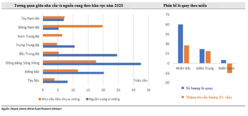 Tương quan cung cầu theo vùng và phân bổ các nhà máy sản xuất xi măng theo công nghệ lò quay theo miền năm 2020