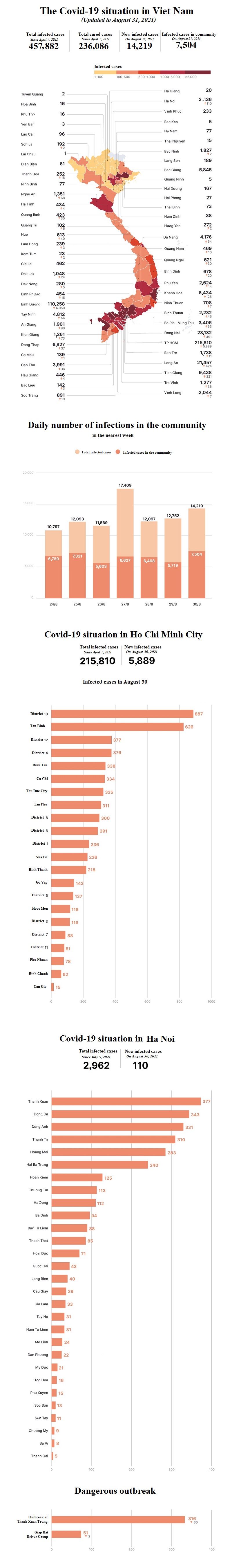 The 5 provinces and cities with the highest number of cases are Ho Chi Minh City (221,254), Binh Duong (114,788), Dong Nai (23,766), Long An (22,044), Tien Giang (9,652).