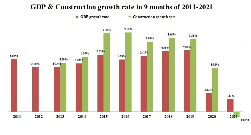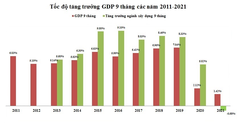 GDP 9 tháng năm 2021 chỉ tăng 1,42% so với cùng kỳ năm trước do dịch Covid-19 ảnh hưởng nghiêm trọng tới mọi lĩnh vực của nền kinh tế, nhiều địa phương kinh tế trọng điểm phải thực hiện giãn cách xã hội kéo dài để phòng chống dịch bệnh. Trong mức tăng chung của toàn nền kinh tế, khu vực nông, lâm nghiệp và thủy sản tăng 2,74%, đóng góp 23,52%; khu vực công nghiệp và xây dựng tăng 3,57%, đóng góp 98,53%; khu vực dịch vụ giảm 0,69%, làm giảm 22,05%.