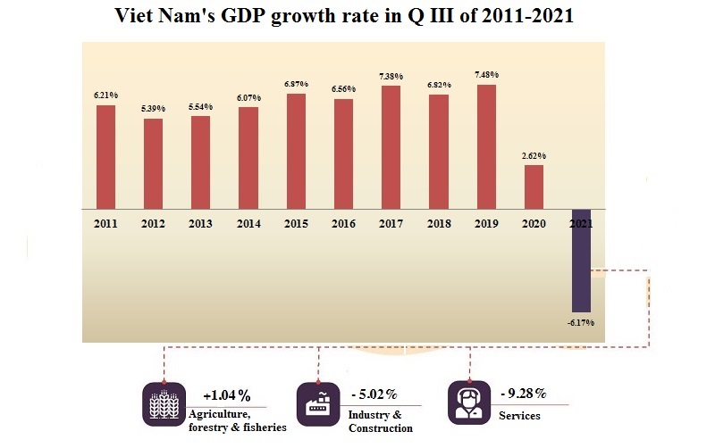 Theo Tổng cục Thống kê, Tổng sản phẩm trong nước (GDP) quý III/2021 ước tính giảm 6,17% so với cùng kỳ năm trước, là mức giảm sâu nhất kể từ khi Việt Nam tính và công bố GDP quý đến nay. Trong đó, khu vực nông, lâm nghiệp và thủy sản tăng 1,04%; khu vực công nghiệp và xây dựng giảm 5,02%; khu vực dịch vụ giảm 9,28%. Về sử dụng GDP quý III/2021, tiêu dùng cuối cùng giảm 2,83% so với cùng kỳ năm trước; tích lũy tài sản tăng 1,61%; xuất khẩu hàng hóa và dịch vụ tăng 2,51%; nhập khẩu hàng hóa và dịch vụ tăng 10,75%.