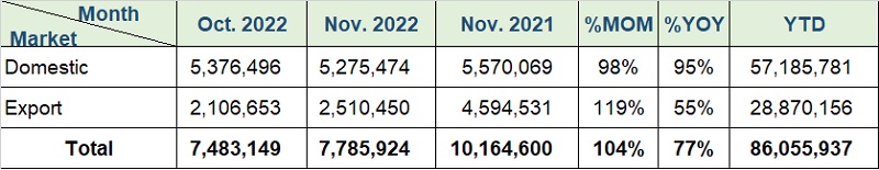 In terms of export value, it increased by 13% compared to October to approximately USD 106.41 million, equivalent to 53% over the same period in 2021.