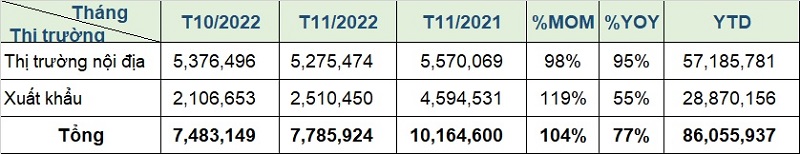 Về giá trị xuất khẩu tăng 13% so với tháng 10 đạt xấp xỉ 106,41 triệu USD, tương đương 53% so với cùng kỳ 2021.