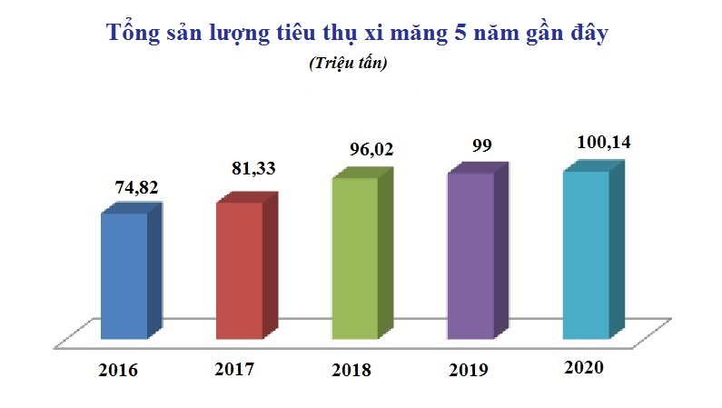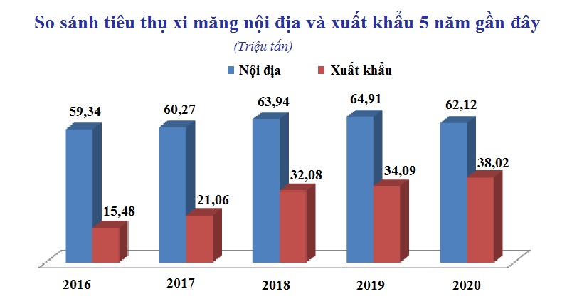 Thị trường nội địa tiếp tục là khu vực tiêu thụ chính của ngành xi măng, nhưng khoảng cách với kênh xuất khẩu đang bị rút ngắn lại. Năm 2020, do ảnh hưởng của đại dịch, tiêu thụ nội địa đã giảm 3 triệu tấn so với năm 2019, chỉ còn 62,1 triệu tấn, nhưng nhờ xuất khẩu tăng mạnh với 38 triệu tấn, ngành xi măng vẫn đạt doanh số tieu thụ trên 100 triệu tấn.